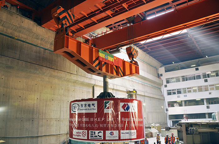 吉布3水电站位于埃塞俄比亚西南部,是该国已建成的最大水电站。电站总装机容量187万千瓦(10×187MW),机电公司承担电站机电设备安装工程,并于2016年创造了“一年十投”的水电装机世界记录